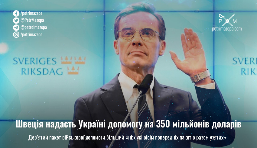Прем'єр-міністр Швеції Ульф Крістерссон повідомив, що його країна надасть Україні дев’ятий пакет допомоги на 350 млн доларів. Він буде включати 286 мільйонів доларів на військову підтримку та ще 69 мільйонів — на гуманітарну допомогу Україні. Частину коштів із цього гуманітарного бюджету також отримає й Молдова.