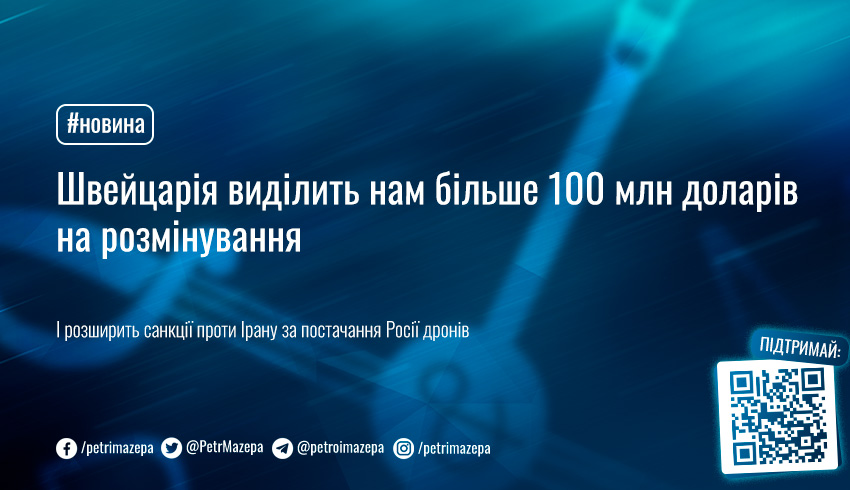 Федеральна рада (уряд) Швейцарії на засіданні сьогодні, 29 вересня, затвердила пакет допомоги у 100 мільйонів швейцарських франків (близько 109,4 мільйона доларів) для розмінування цивільних і сільськогосподарських територій в Україні й надання допомоги у відновленні.