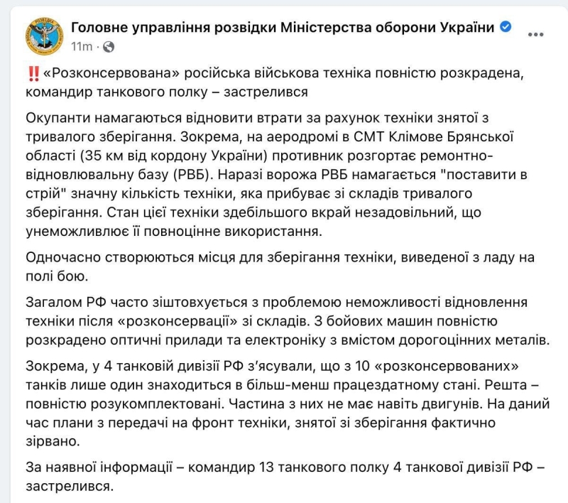 Зіткнувшись із величезними втратами техніки в Україні, Росія почала розконсервування техніки з баз зберігання. Але й тут ситуація виглядає поганою: за даними ГУР МО, 4-та танкова дивізія Росії виявила, що лише 1 з 10 знятих зі зберігання танків придатний до використання.