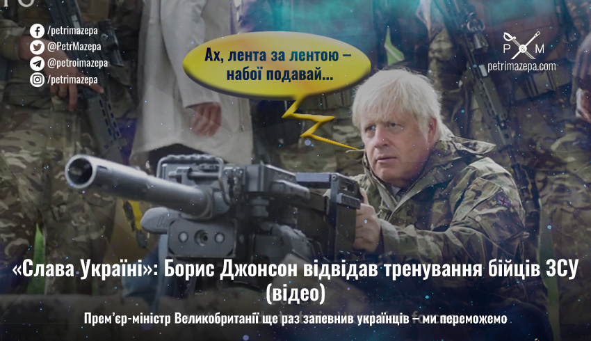 Прем’єр-міністр Великої Британії Борис Джонсон відвідав тренувальний табір для бійців Збройних сил України. Він взяв участь у тренуванні, особисто оцінив деякі види озброєння та висловив упевненість у перемозі України.