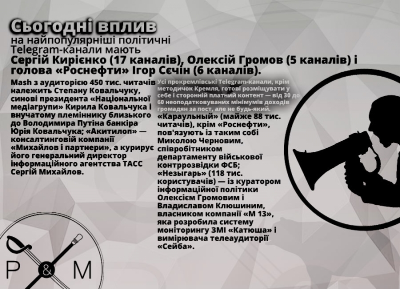 Сьогодні вплив на найпопулярніші політичні Telegram-канали мають Сергій Кирієнко (17 каналів), Олексій Громов (5 каналів) і голова «Роснефти» Ігор Сєчін (6 каналів). Mash з аудиторією 450 тис. читачів належить Степану Ковальчуку, синові президента «Національної медіагрупи» Кирила Ковальчука і внучатому племіннику близького до Володимира Путіна банкіра Юрія Ковальчука; «Акитилоп» — консалтинговій компанії «Михайлов і партнери», а курирує його генеральний директор інформаційного агентства ТАСС Сергій Михайлов.