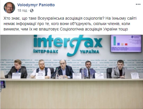 «Хто знає, що таке Всеукраїнська асоціація соціологів? — написав відомий соціолог, професор Володимир Паніотто вночі проти 14 лютого у своєму Facebook. — На їхньому сайті немає інформації про те, кого вони об’єднують, скільки членів, коли виникли, чим їх не влаштовує Соціологічна асоціація України тощо?»