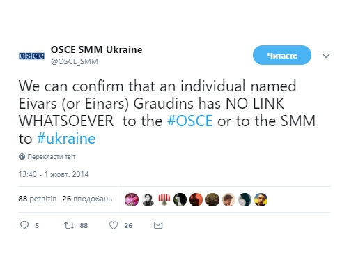 30 вересня 2014 року газета «Вечірня Москва» опублікувала інтерв’ю з латвійським політологом Ейнарсом Граудінсом, якого представили як «експерта ОБСЄ». Однак ця людина не мала жодного стосунку до ОБСЄ (Організації з безпеки і співпраці у Європі). Це підтвердила місія ОБСЄ в Україні у своєму офіційному Twitter.