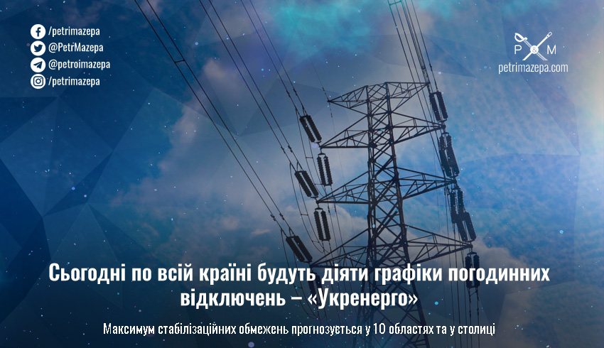 Сьогодні по всій Україні будуть діяти погодинні графіки відключення електроенергії — про це повідомляє компанія «Укренерго» у Telegram.