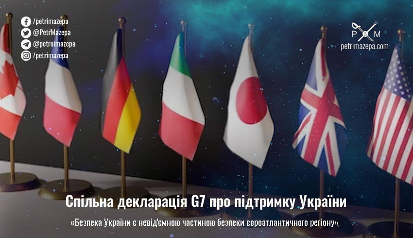 Лідери «Групи семи» (G7) оприлюднили спільну декларацію про підтримку України, у якій підтвердили непохитну відданість стратегічній меті створення вільної, незалежної, демократичної та суверенної України в межах її міжнародно визнаних кордонів, здатної захистити себе та стримати майбутню агресію.