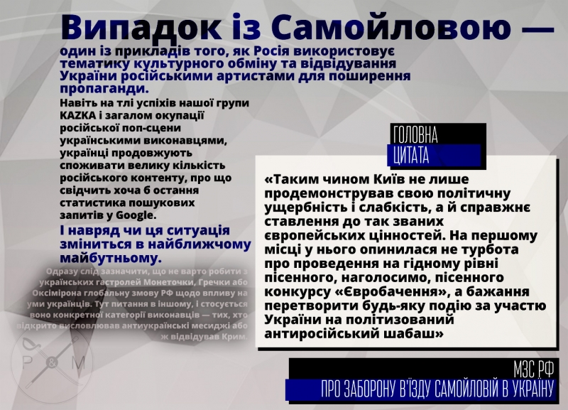 Випадок з Самойловою — один із прикладів того, як Росія використовує тематику культурного обміну та відвідування України російськими артистами для поширення пропаганди. Навіть на тлі успіхів нашої групи KAZKA і загалом окупації російської поп-сцени українськими виконавцями, українці продовжують споживати велику кількість російського контенту, про що свідчить хоча б остання статистика пошукових запитів у Google. І навряд чи ця ситуація зміниться в найближчому майбутньому. Тому було б наївним припускати, що Росія не хотіла б скористатися таким широким полем для маніпуляцій, як візити цих артистів в Україну для проведення концертів.