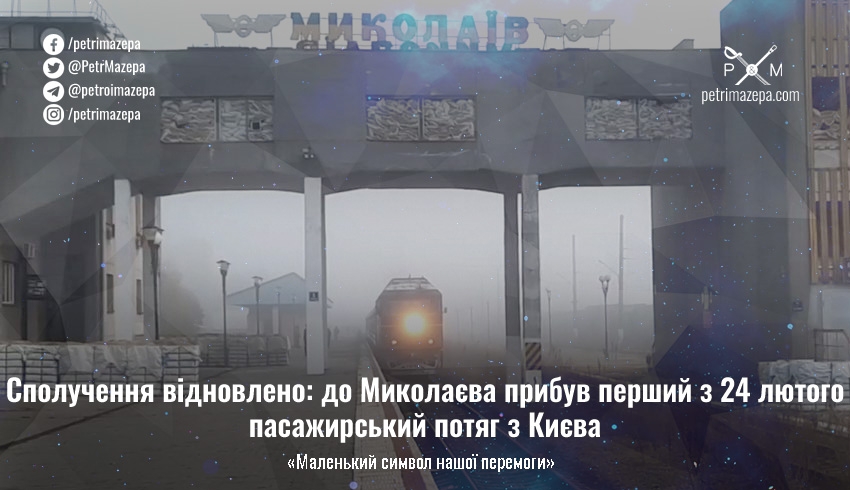 Сьогодні, 15 листопада, вранці до залізничного вокзалу в Миколаєві прибув потяг № 122/121 Київ — Миколаїв. Відновлення залізничного сполучення з Миколаєвом «Укрзалізниця» анонсувала вчора. Це перший рейсовий пасажирський потяг на вокзалі Миколаєва з 24 лютого.