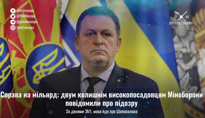 Колишньому заступнику Міністерства оборони України повідомили про підозру у справі про закупівлі неякісної амуніції для ЗСУ на понад мільярд гривень. За даними ЗМІ, йдеться про В’ячеслава Шаповалова, якому раніше вже повідомляли про підозру у причетності до закупівель за завищеними цінами.