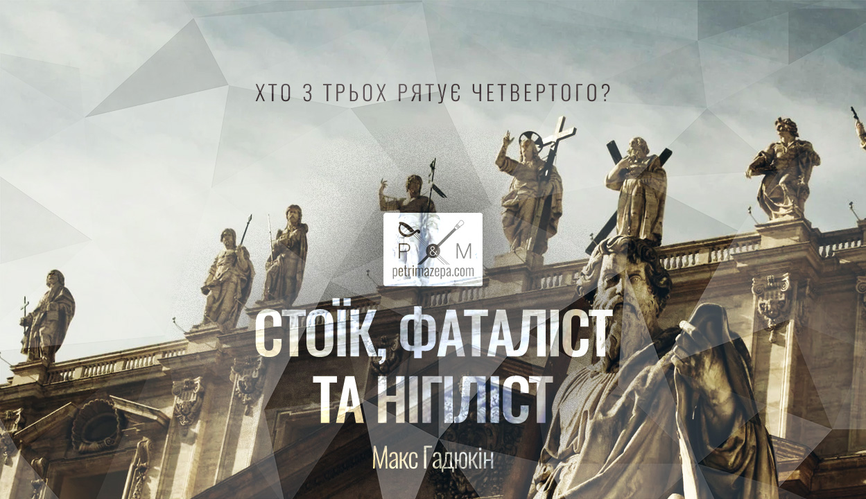 Уявіть собі ситуацію десь на сході України. Щойно у вас відбувся артилерійський обстріл. Або, може, росіяни не пошкодували ракети. На місці було четверо бійців, постраждав один. Троє вцілілих за поглядами максимально близькі до згаданих течій (навіть якщо не знають таких слів): один більше нагадує стоїка, другий фаталіста, третій — справжнісінький нігіліст.