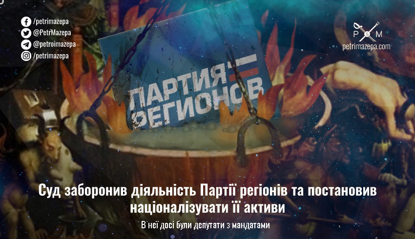 За матеріалами розслідувань СБУ і ДБР Восьмий апеляційний адміністративний суд задовольнив позов Мін’юсту щодо заборони діяльності «Партії регіонів» та передачі у держвласність України майна проросійської політсили. Як зазначає рух «ЧЕСНО», у цій партії досі залишалися депутати з мандатами.