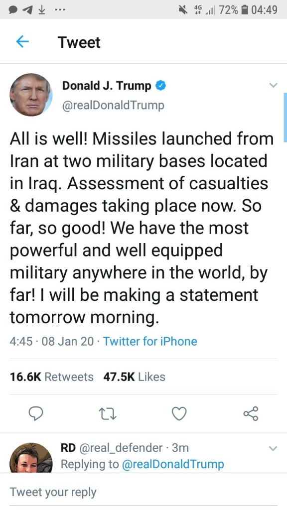 Напруга на Близькому Сході і тиск безпосередньо на Іран зростали пропорційно до наближення дати американських виборів, хоча факторів, які впливали на вчинки Трампа і його адміністрації, було набагато більше. Іноді це набувало комічного характеру: у листопаді 2018 року Дональд Трамп і Касем Сулеймані обмінялись погрозами у дуже незвичному форматі: