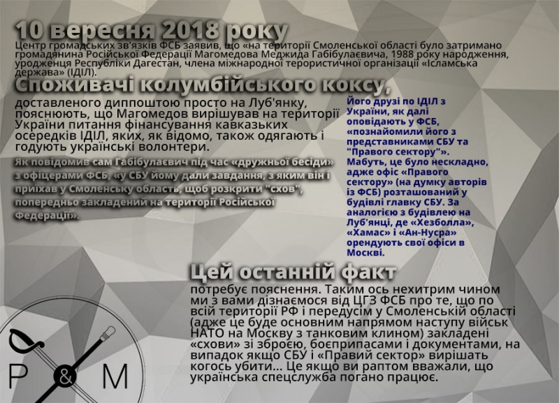 На жаль, щодо вмісту «схову» це я вже додумав, бо самі феесбешники повідомляють, що Магомедова затримали з вибухівкою (1,5 кг) і пістолетом із глушником. Лейтмотивом повідомлення, як ви вже зрозуміли, було «СБУ – правосеки – ІДІЛ» — це «мир – дружба – жуйка – смерть Росії». Тому кожен росіянин мусить пам'ятати про те, що СБУ, «Правий сектор» та ІДІЛ — це, в принципі, одна й та сама організація, створена на підставі придуманої в австро-угорському штабі української мови, за гроші Держдепу і «печива Нуланд».