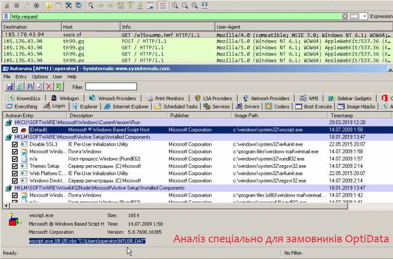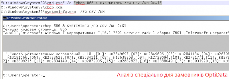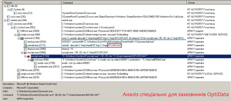 Фактично після запуску приманки усю роботу по закріпленню та збору виконують вбудовані утиліти: cmd, wscript та systeminfo.