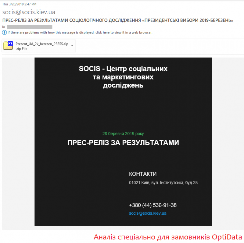 Якщо у попередньому випадку фішинговий лист був майже порожнім, то цього разу для того, аби змусити жертву запустити приманку, взяли аналітику на тему виборів (перший тур відбувся 31/03/19):