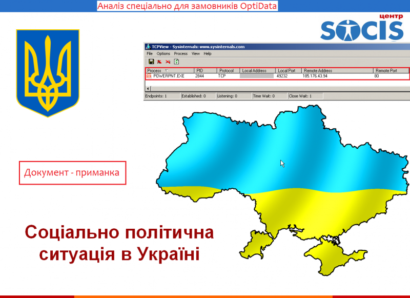 У приєднаному архіві була презентація з аналітикою по виборах. Якщо жертва запускала приманку, PowerPoint починав обробляти посилання, що містилося в одному із ресурсних файлів (xml.rels)