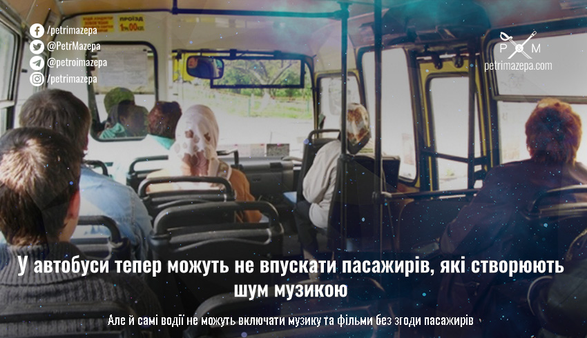 Кабінет міністрів України обмежив використання музики у громадському транспорті, водії автобусів мають право не допускати до салону пасажирів, які створюють шум за допомогою технічних пристроїв.