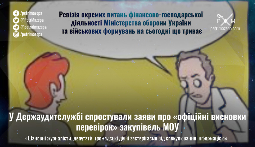 Державна аудиторська служба України спростувала заяви ЗМІ про «офіційні висновки» про результати перевірок Міністерства оборони України. Вони закликають всіх не спекулювати інформацією, бо перевірка ще триває.