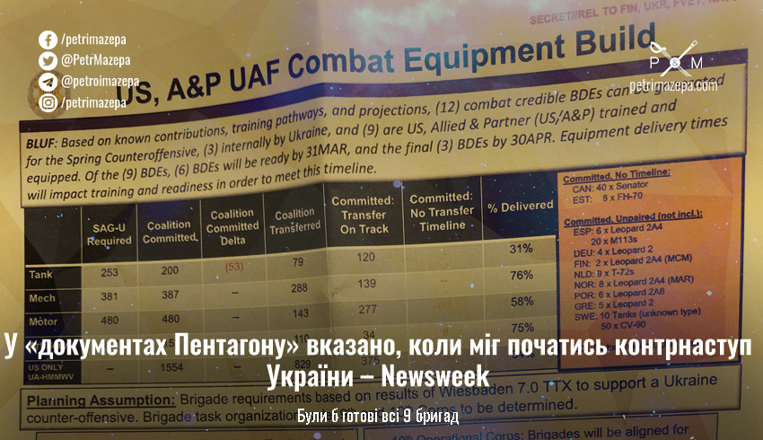У «документах Пентагону», які нещодавно потрапили у мережу, зазначається, що підготовка сил контрнаступу України була б завершена остаточно до 30 квітня, й саме на таку дату, на думку журналістів Newsweek, й було заплановано почати великий контрнаступ.