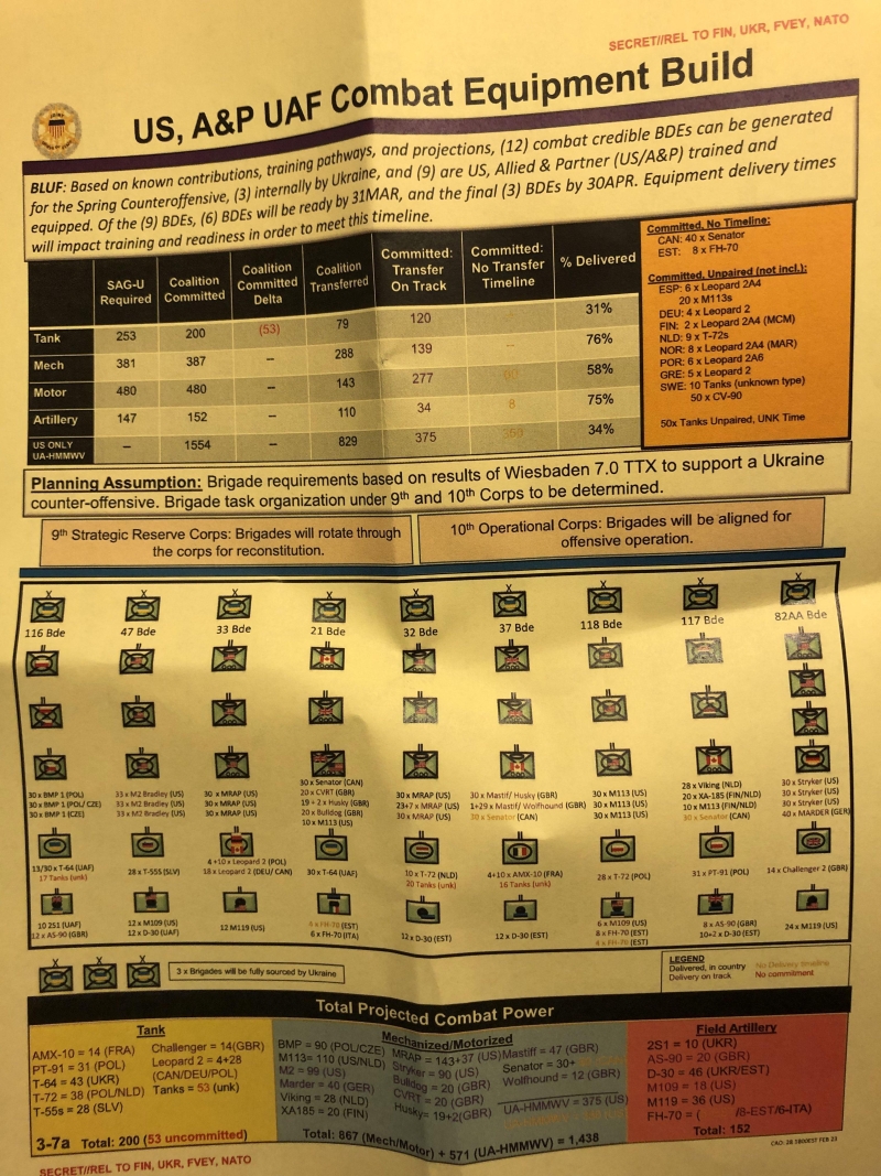 У документах вказано, що кульмінацією постачання зброї стане «Весняний контрнаступ», до якого планується підготувати війська — й усі завдання повинні бути завершені за планом до 30 квітня. Дев’ять бригад будуть значно посилені до того моменту. Загалом їм планується передати 253 танка, 381 бойових машин, 480 транспортних засобів, 147 одиниць артилерії, 571 автомобіль HMMWV.