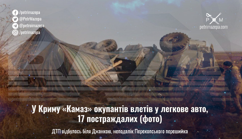 Аварія сталася біля села Орденоносне, під Джанкоєм, неподалік від Перекопського перешийка. «Камаз» окупантів влетів в лоб у автомобіль Mitsubishi Lancer, після чого вантажівка з позначкою V вилетіла с дороги та перевернулася. На фото можна побачити значні пошкодження «Камазу».