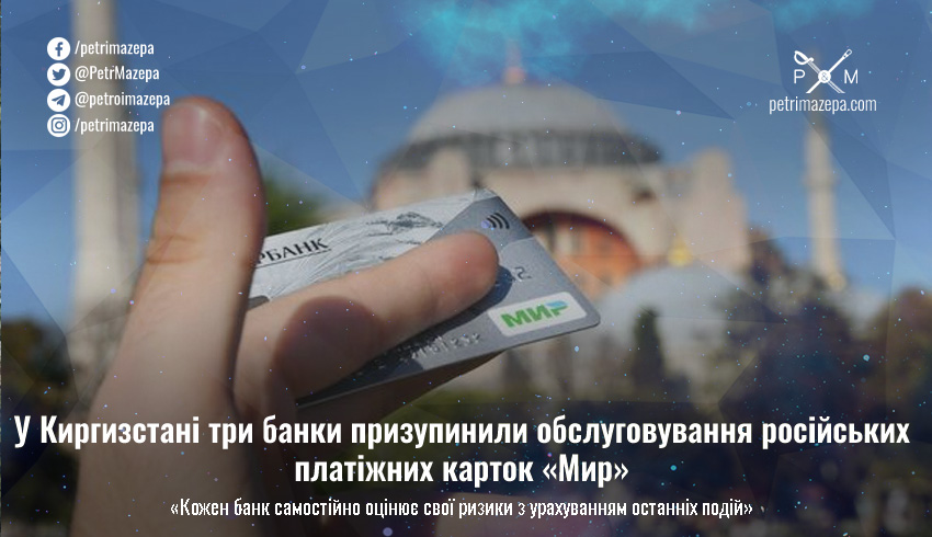 Ряд комерційних банків у Киргизстані призупинив обслуговування російських карток «Мир». Конкретної причини у банках не називають, відповідаючи завуальовано про «рішення керівництва».