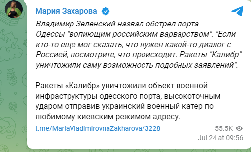Згодом аналогічну версію подій озвучила й офіційна представниця МЗС РФ Марія Захарова.