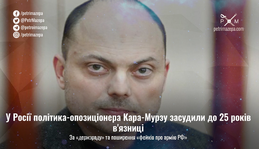 Російського політика-опозиціонера Володимира Кара-Мурзу засудили до 25 років позбавлення волі. Причина — так звана «держзрада» та поширення «фейків про армію РФ». Справа розглядалася у закритому режимі.