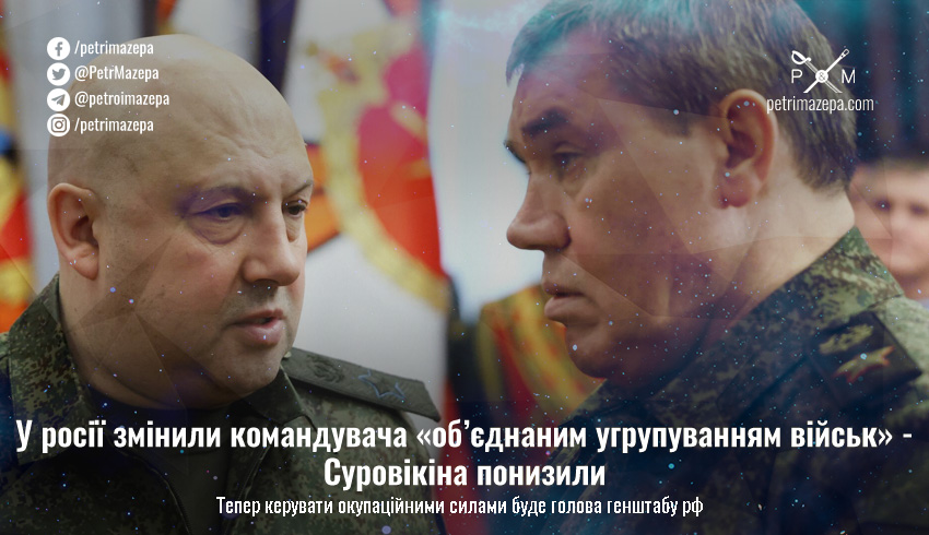 Ворог змінив командувача власними окупаційними силами — тепер ними керуватиме особисто голова Генштабу росії Валерій Герасімов, а генерал Суровікін, якого з таким піаром призначали на посаду ще нещодавно, став тільки його заступником, одним із багатьох.