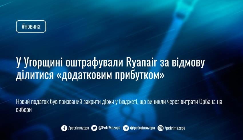 Угорщина наклала на Ryanair штраф у розмірі 780 тисяч доларів за маніпуляції з оплатою спеціального податку, введеного нещодавно для великого бізнесу, який на думку влади, отримує «додаткові прибутки».