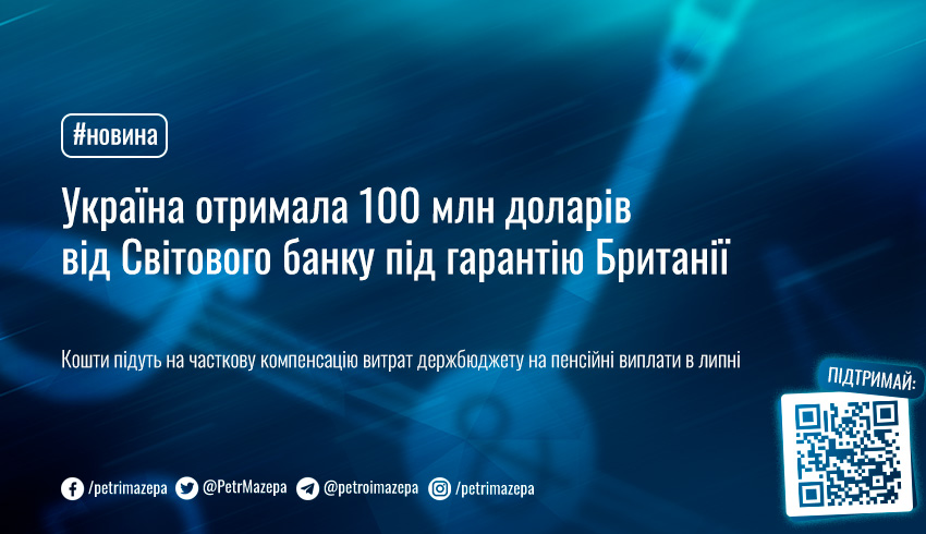 Україна вчора, 25 вересня, отримала 100 мільйонів доларів від Світового банку під гарантію Великої Британії.