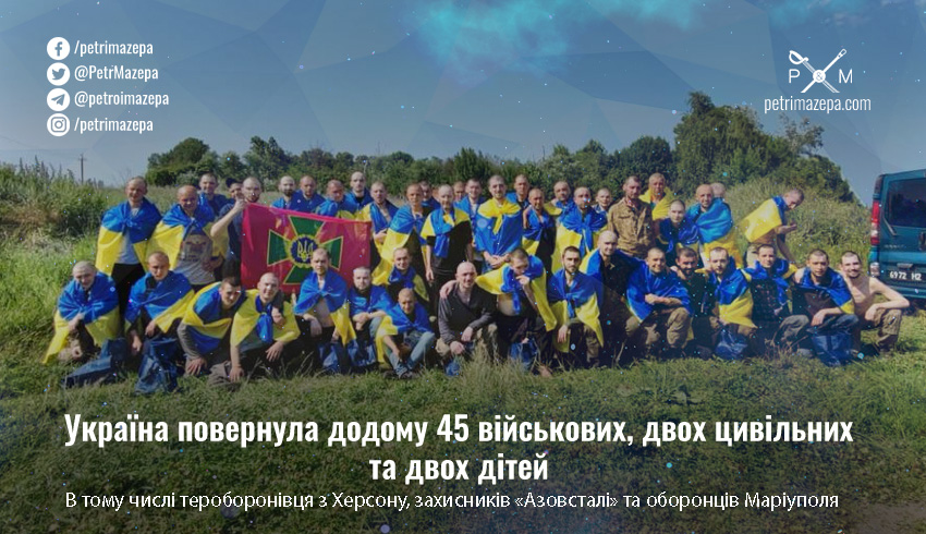 Україні вдалося повернути з полону 45 військових і двох цивільних, а також з росії були повернуті двоє дітей, мати яких, бойовий медик, була звільнена з полону ще в жовтні 2022 року.