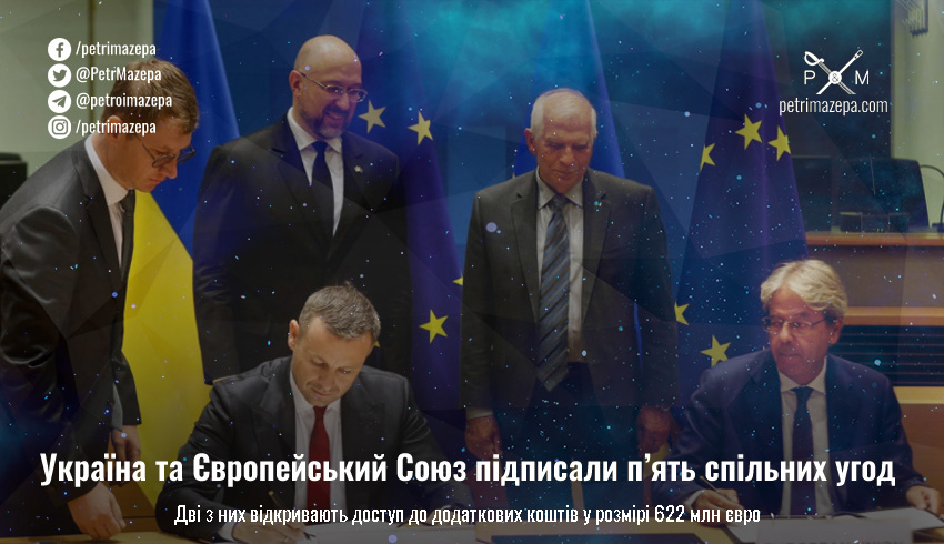 5 вересня в Брюсселі у присутності Прем’єр-міністра України Дениса Шмигаля було підписано п’ять угод між Україною та Європейським Союзом. Вони дозволять Україні взяти участь у кількох програмах ЄС, а також відкривають доступ до додаткових коштів у розмірі 622 млн євро.