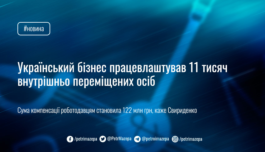 Український бізнес працевлаштував 11 тисяч внутрішньо переміщених осіб у рамках урядової програми компенсації роботодавцям за працевлаштування людей, які залишили свої оселі через військову агресію Росії.