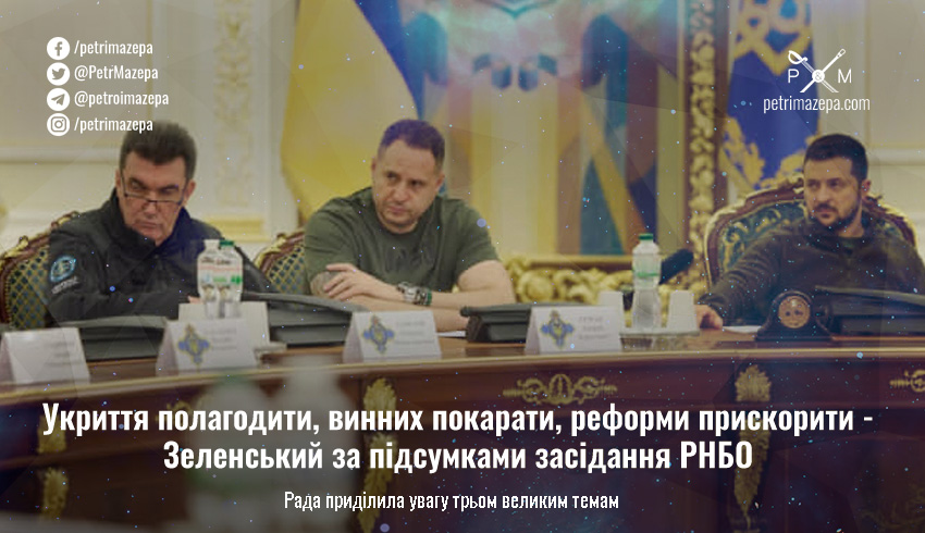 Президент Володимир Зеленський підбив підсумки засідання Ради національної безпеки та оборони. Результати - укриття полагодити, винних покарати, реформи прискорити, відповідальність за корупцію в системі правосуддя посилити.