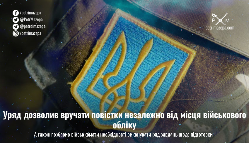 Кабінет Міністрів України вніс зміни до положення про територіальні центри комплектування та соціальної підтримки (колишні військкомати). Їм дозволили вручати повістки військовозобов'язаним незалежно від місця перебування на військовому обліку.
