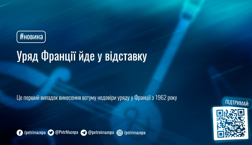 Французькі парламентарі відправили уряд у відставку: ультраправі та ліві парламентарії об’єднали зусилля, щоб підтримати вотум недовіри прем’єру Мішелю Барньє та його кабінету. Це рішення підтримав 331 депутат із 574.