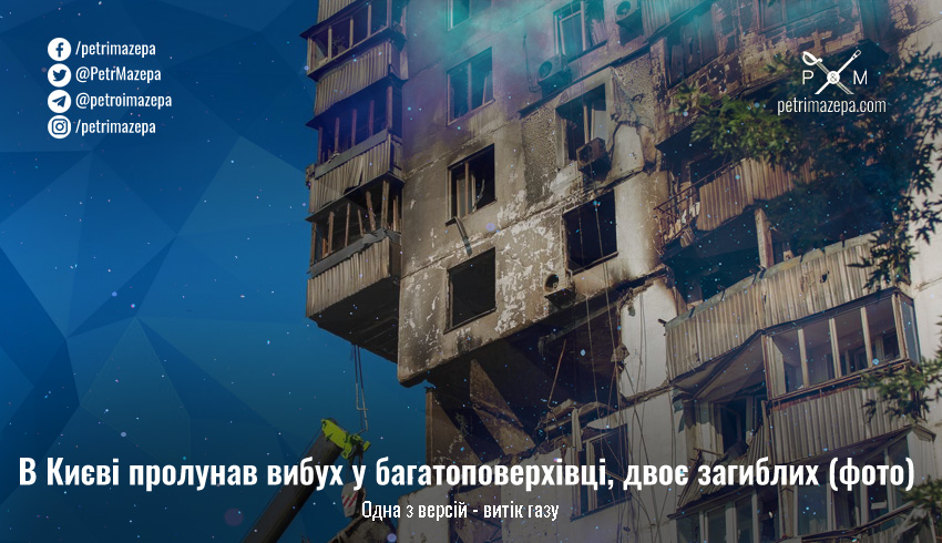 Вночі в Києві стався вибух у 16-поверховому будинку, внаслідок якого загинули 2 людини, ще 5 постраждали, відбулося руйнування кількох поверхів. Причини вибуху ще не відомі, але одна з версій — це виток газу.