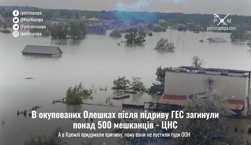 «За попередніми даними, понад 500 мешканців тимчасово окупованих Олешок, що на лівобережжі Херсонщини, загинули через підрив росіянами Каховської ГЕС. Люди загинули через те, що окупанти відмовили в евакуації тим, хто не має російського паспорта», — зазначає Центр національного спротиву.