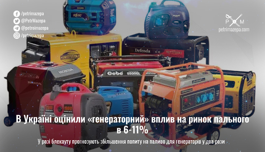 З'явилася перша оцінка впливу масового використання генераторів на попиту на пальне. Згідно з оцінками Консалтингової групи А-95, попит на бензин зріс на 6%, а на дизельне пальне — на 10-11%. І це не спричинить дестабілізації ринку чи дефіциту пального. Навіть у разі блекауту, коли попит з боку власників генераторів подвоїться.