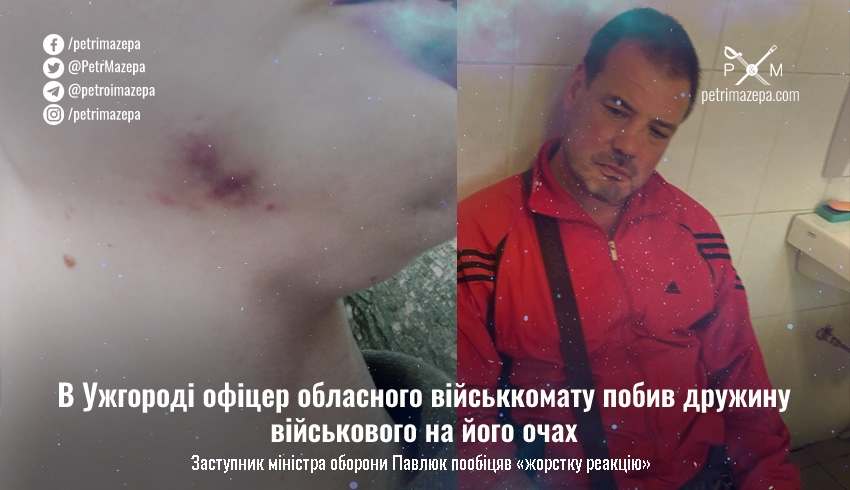 В Ужгороді старший офіцер Закарпатського ОВК жорстоко побив жінку, яка була із чоловіком-військовим. Про це постраждала розповіла вчора в Facebook, оскільки від події вже минув тиждень, а в поліції чомусь дуже неспішно ведуть розслідування. Вже з’явилася реакція як від самого обласного військкомату, так й від Міністерства оборони.