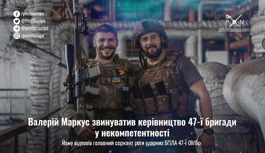 Головний майстер-сержант 47-ї окремої механізованої бригади (ОМБр) «Маґура» Валерій Маркус оприлюднив фото свого рапорту, в якому він звинувачує керівництво підрозділу у некомпетентності та просить перевести його на найнижчу посаду. У відповідь на такий публічний крок про недоліки роботи самого Маркуса написав головний сержант роти ударних БПЛА 47-Ї ОМБр Рустам Мустафаєв.