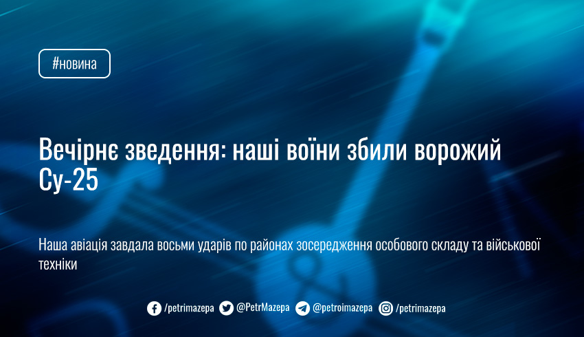 Наша авіація сьогодні завдала вісім ударів по районах зосередження особового складу та військової техніки окупантів. Наші воїни збили літак Су-25.