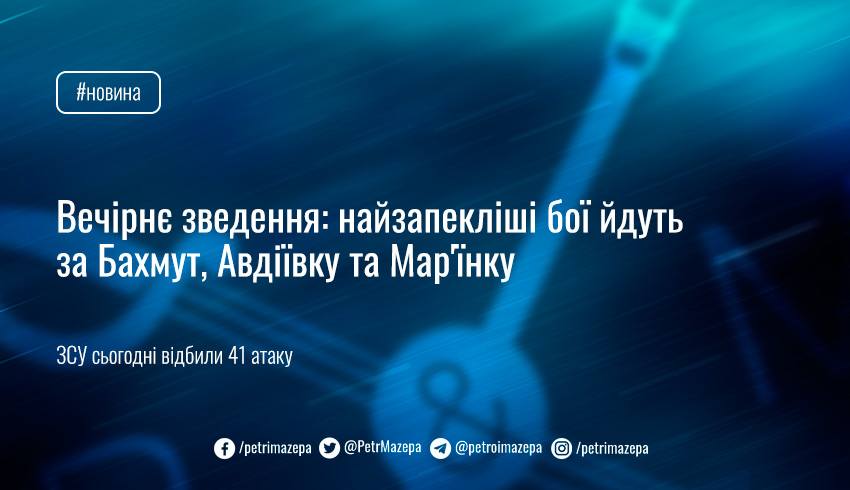Окупанти наступають на Лиманському, Бахмутському, Авдіївському та Мар'їнському напрямках. Найзапекліші бої тривають за Бахмут, Авдіївку та Мар'їнку. ЗСУ відбили 41 атаку на цих напрямках.