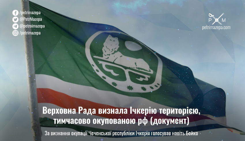 Верховна Рада прийняла постанову про визнання Чеченської Республіки Ічкерія територією, тимчасово окупованою росією, й засудила геноцид чеченського народу, так само як і скоєні рф воєнні злочини під час першої та другої Чеченських війн.
