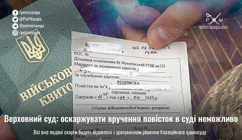 Верховний Суд України визначив, що повістка Територіального центру комплектування та соціальної підтримки не може бути оскаржена в будь-якому суді. Причина — документ є лише засобом оповіщення особи про необхідність виконати військовий обов’язок відповідно до Закону України «Про військовий обов’язок і військову службу».