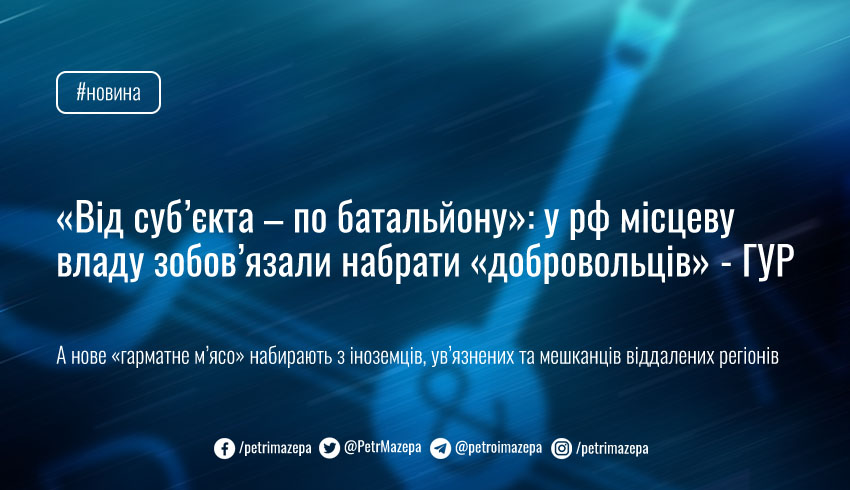 Влада рф, щоб не вдаватися до небажаної мобілізації, вирішила зобов’язати кожен регіон сформувати по батальйону «добровольців». Набирають людей із місць позбавлення волі, мешканців далеких регіонів і навіть іноземців. А мешканців окупованих регіонів України взагалі примушують підписувати «контракт» з армією ворога.