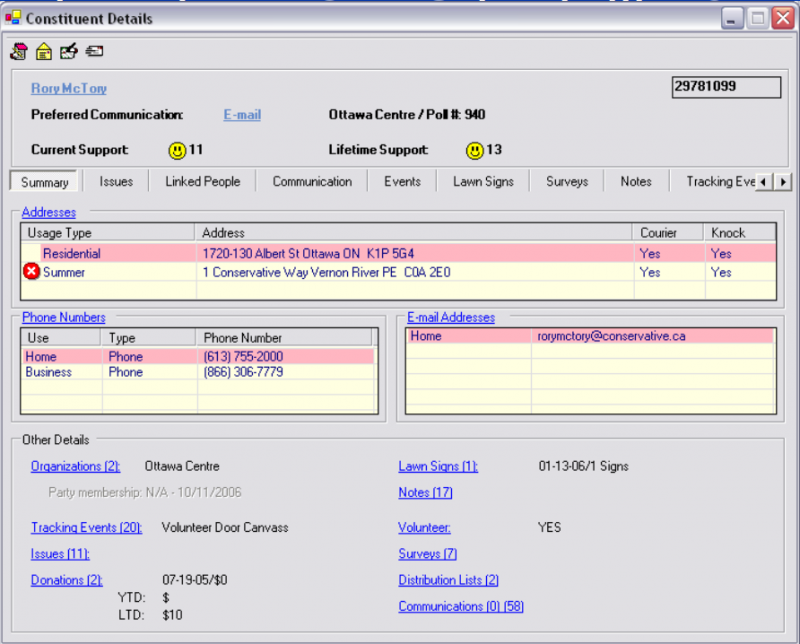 Скріншот CIMS — розробленої у 2004 році бази прихильників Conservative Party of Canada (джерело)