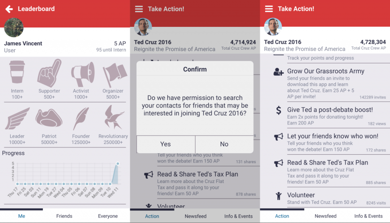 • у додатку Круза було краще: бали давали, якщо користувач давав програмі доступ до свого списку контактів. Програма порівнювала його зі списком «потенційних прихильників», якщо знаходились збіги, користувача просили відвідати цих людей та агітувати їх