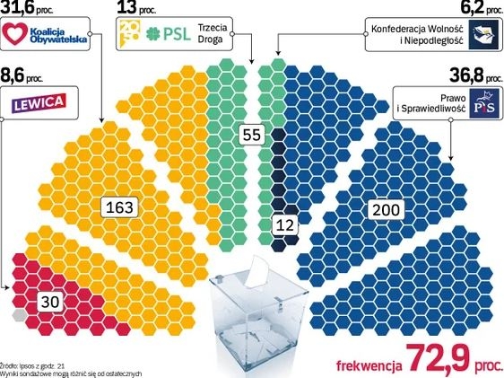 За кількістю місць у Сеймі дані показують таке співвідношення: партія Koalicja Obywatelska — 163 місця, Trzecia Droga — 55 місць, Nowa Lewica — 30 місць, Konfederacja — 12 місць. Таким чином, за розподілом місць у Сеймі опозиція може мати більшість.