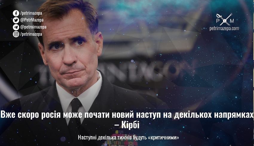 Кірбі оцінив наступні кілька тижнів як «критичні» — тому що США очікують, що путін «спробує почати ще один наступ, й можливо, на кількох різних напрямках». США роблять усе можливе, щоб пересвідчитись, що Україна до цього готова.